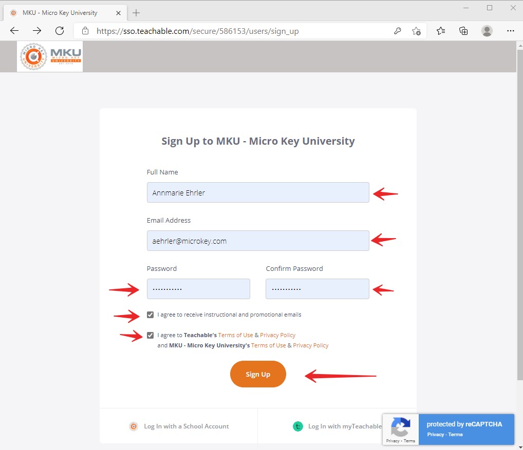 Enter your Full Name, Email Address, create a Password & Confirm, Place Check Marks, Click to Sign Up